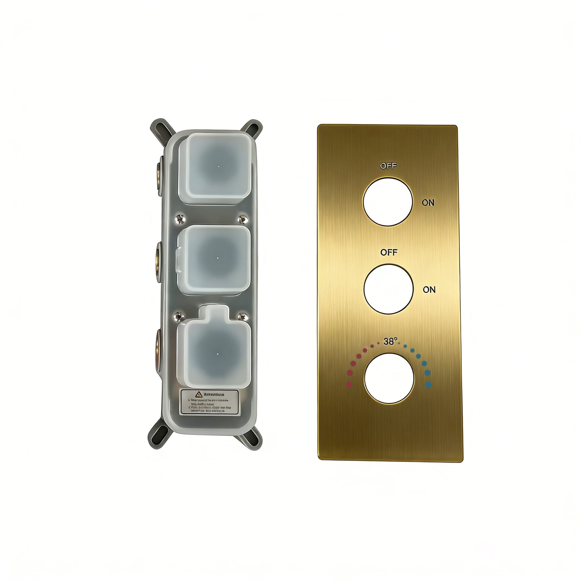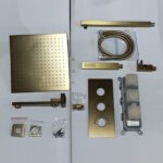 A premium, wall-mounted shower set in a sophisticated brushed gold finish, featuring a large rainfall shower head, handheld wand, and a 3-way thermostatic control valve for a modern spa experience.